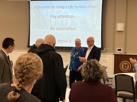Biology Professor and D’Alzon Chair David Crowley received the 2025 Landy Award at a dinner event at his home institution, Assumption College, on October 22. Named for Collegium’s founder Thomas Landy, this award honors an individual who, over several years, has offered superb service to the organization. Since his first colloquy experience in 2008, David has mentored small groups multiple times on all three of Collegium’s host schools, and served two terms on the Board, including one as Chair. When the colloquy is at Holy Cross in his Worcester neighborhood, David has been the unofficial Chief Procurement Officer, providing the snacks and beverages for nightly socials. His recurring question over 17 years is “what does Collegium need me to do?” and then he goes about that cheerfully and generously. As the photos here illustrate, his colleagues at Assumption didn’t even wait for the full citation to be read before erupting into a rousing standing ovation for a cherished community member who serves his university every bit as big-heartedly as he does Collegium. Congratulations, David Crowley!