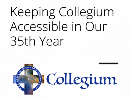 To that end, our website—www.collegium.org—now has a Donate button to allow those who’ve brought Collegium’s lessons home to make a modest contribution to build up an endowment to help schools defray the costs of annual membership dues. In honor of Collegium’s 35th anniversary, we invite you to make a $35 donation. 100% of funds from your one-time or recurring gift will directly support schools’ abilities to send someone to the colloquy. If you feel so moved, there’s even an option to increase the amount you give. With over 3000 Collegium alums out there, we can help form faculty to infuse principles of Catholic social teaching and intellectual tradition, sacramental and prophetic imaginations into their work, keeping the mission—our collective reason for being—at the front of our teaching and creative scholarly work.